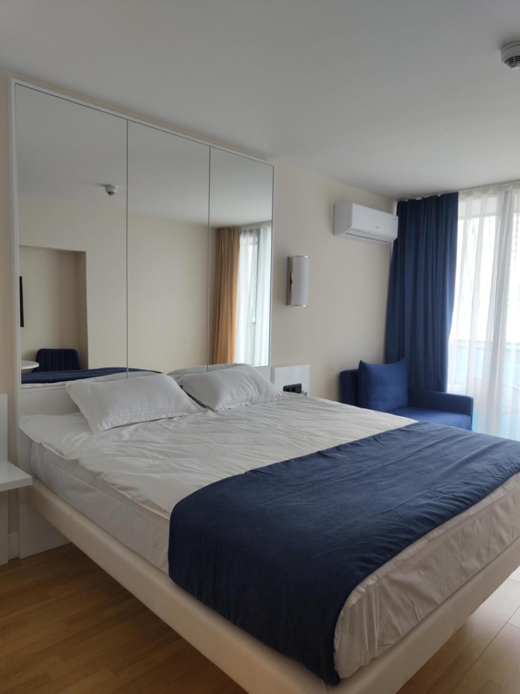 One-Bedroom Apartment. This apartment includes 1 living room, 1 separate bedroom and 1 bathroom with a shower and free toiletries. Guests can make meals in the kitchen that is fitted with a stovetop, a refrigerator and kitchenware. The air-conditioned apartment offers a flat-screen TV with cable channels, a washing machine, a wardrobe, an electric kettle as well as sea views. The unit has 2 beds.