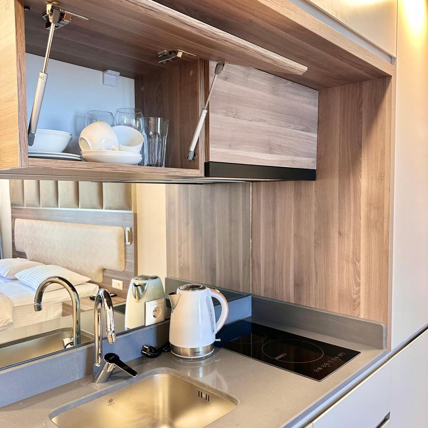 Studio with Balcony. The pool with a view is a top feature of this studio. The studio features air conditioning, a washing machine, as well as a private bathroom boasting a shower and a hairdryer. The fully equipped kitchen has a stovetop, a refrigerator, kitchenware and an electric kettle. Featuring a balcony, this studio also offers a dining area, a wardrobe and a flat-screen TV. The unit has 1 bed. ;