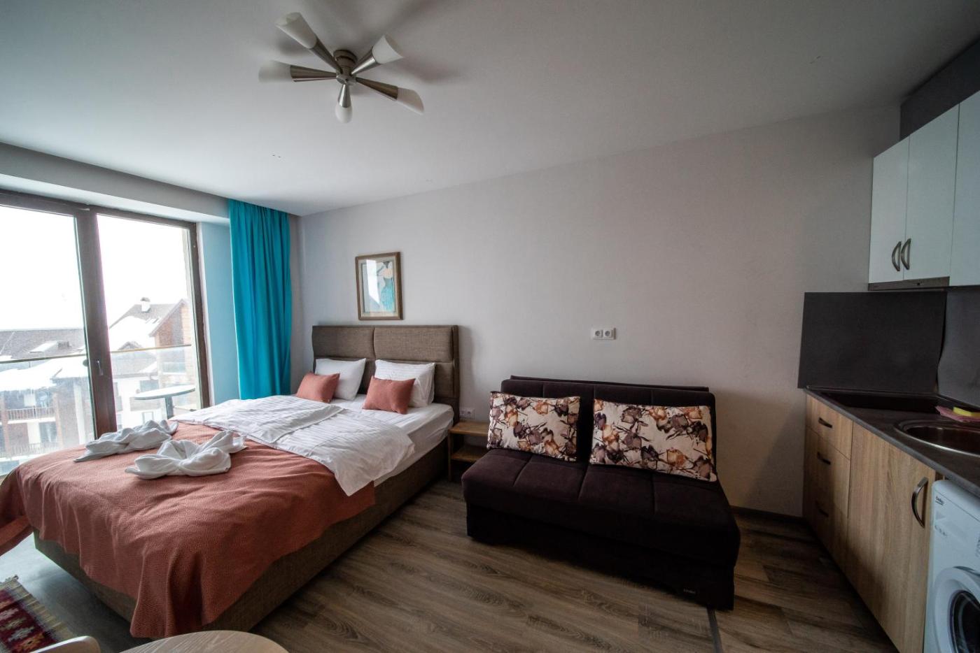 Deluxe Double Studio. The fully equipped kitchen features a stovetop, a refrigerator, kitchenware and a microwave. The studio provides a washing machine, a private entrance, a balcony with mountain views as well as a private bathroom featuring a shower. The unit offers 2 beds. ;