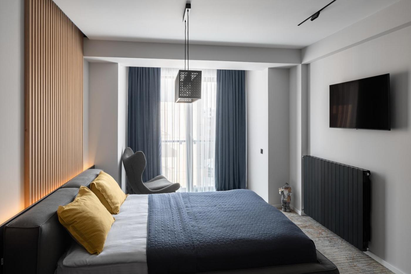 One-Bedroom Apartment. The kitchen features a refrigerator, kitchenware and a microwave. This apartment has Smartphone, a tea and coffee maker, flat-screen TV with streaming services, as well as winechampagne for guests. The unit has 1 bed.