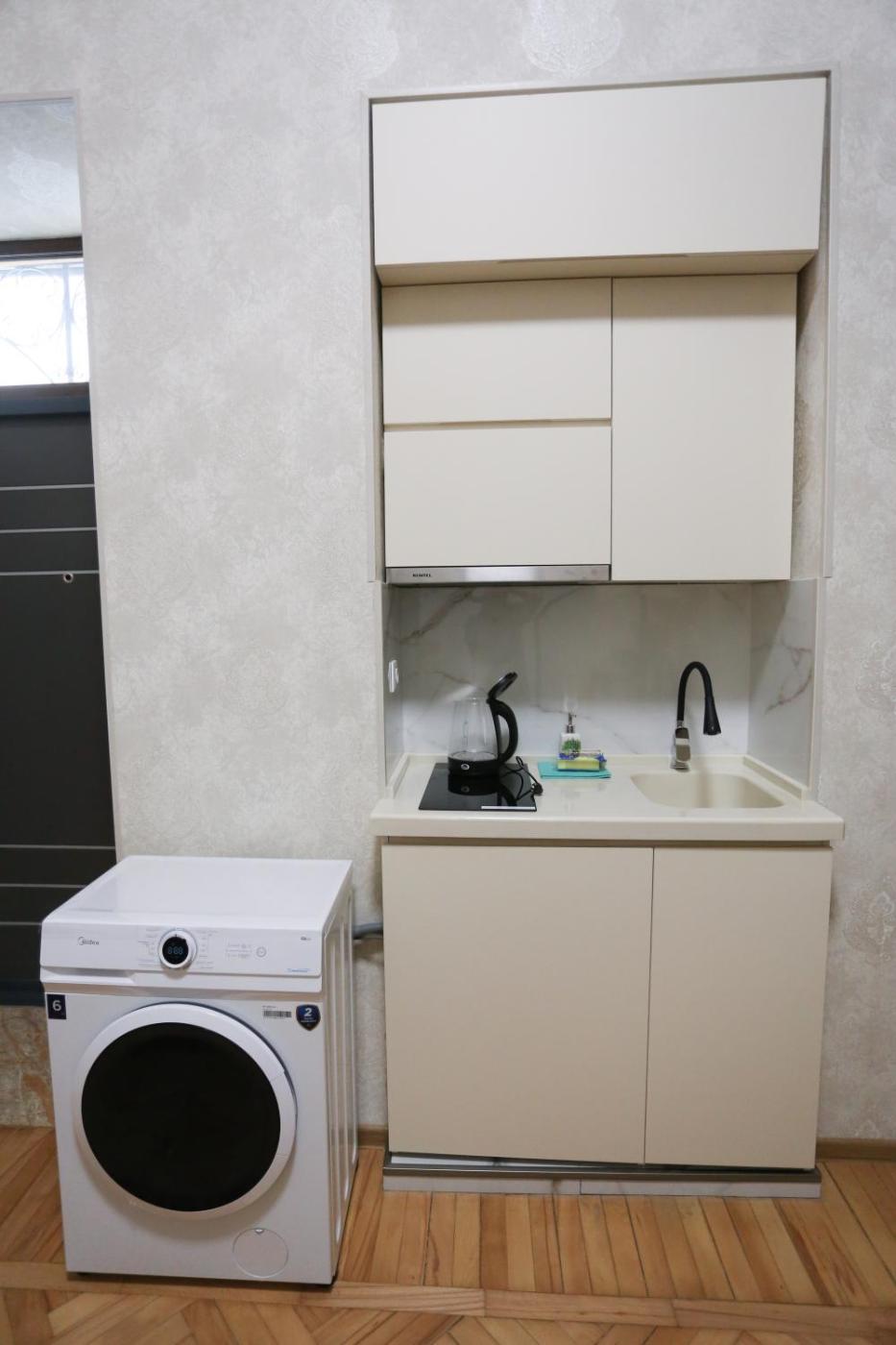 One-Bedroom Apartment. Featuring a private entrance, this air-conditioned apartment consists of a kitchenette, 1 bedroom and 1 bathroom with a shower and slippers. Guests can make meals in the kitchenette that is equipped with a stovetop, a refrigerator, kitchenware and a tea and coffee maker. The apartment features parquet floors, a seating area with a flat-screen TV, a washing machine, a dining area, as well as a wardrobe. The unit offers 1 bed.